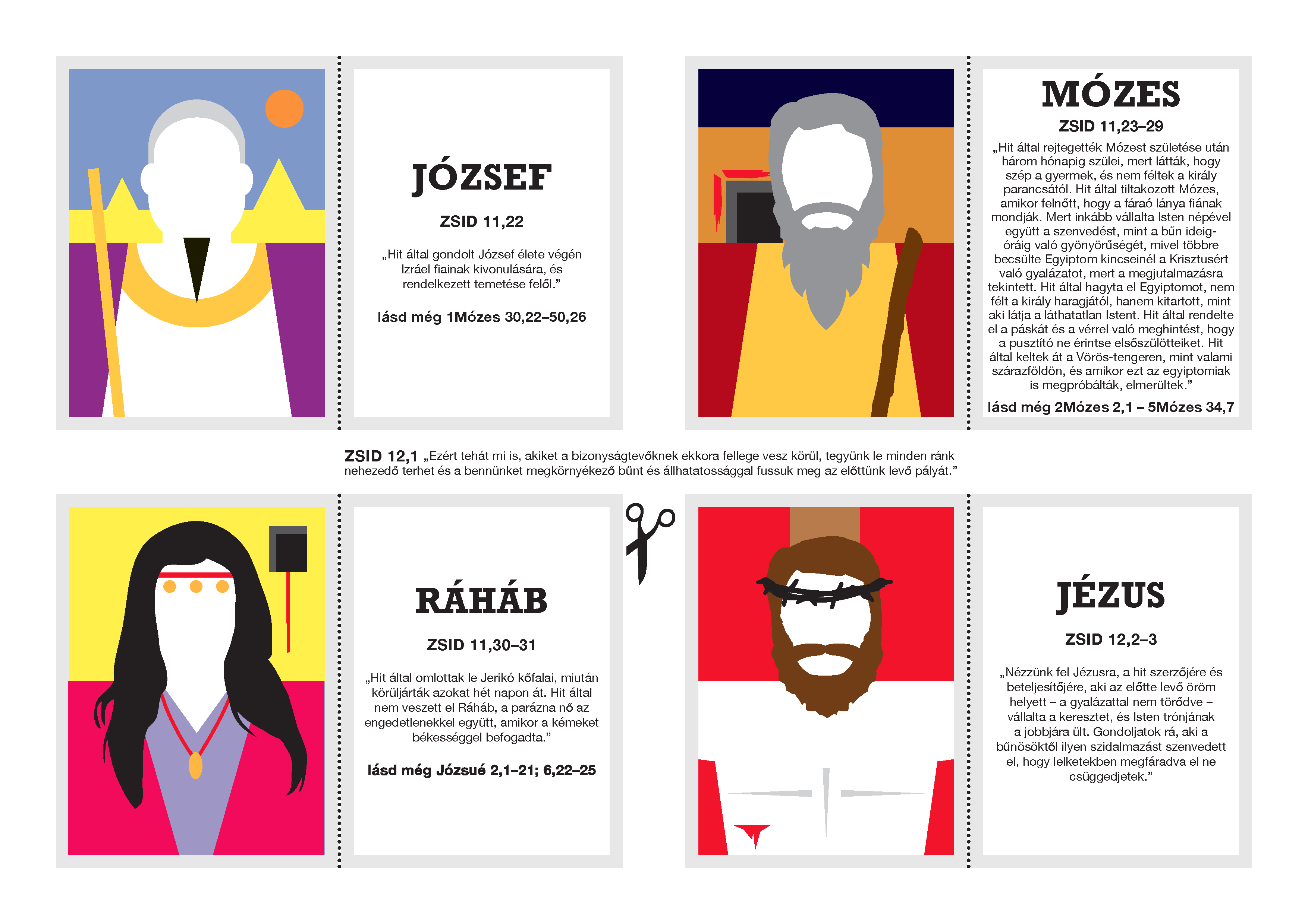 A zsidókhoz írt levél 11-12. fejezetében felsorolt hithősök Ábeltől kezdve Ráhábon át egészen Jézusig, aki a hitünk szerzője és beteljesítője.