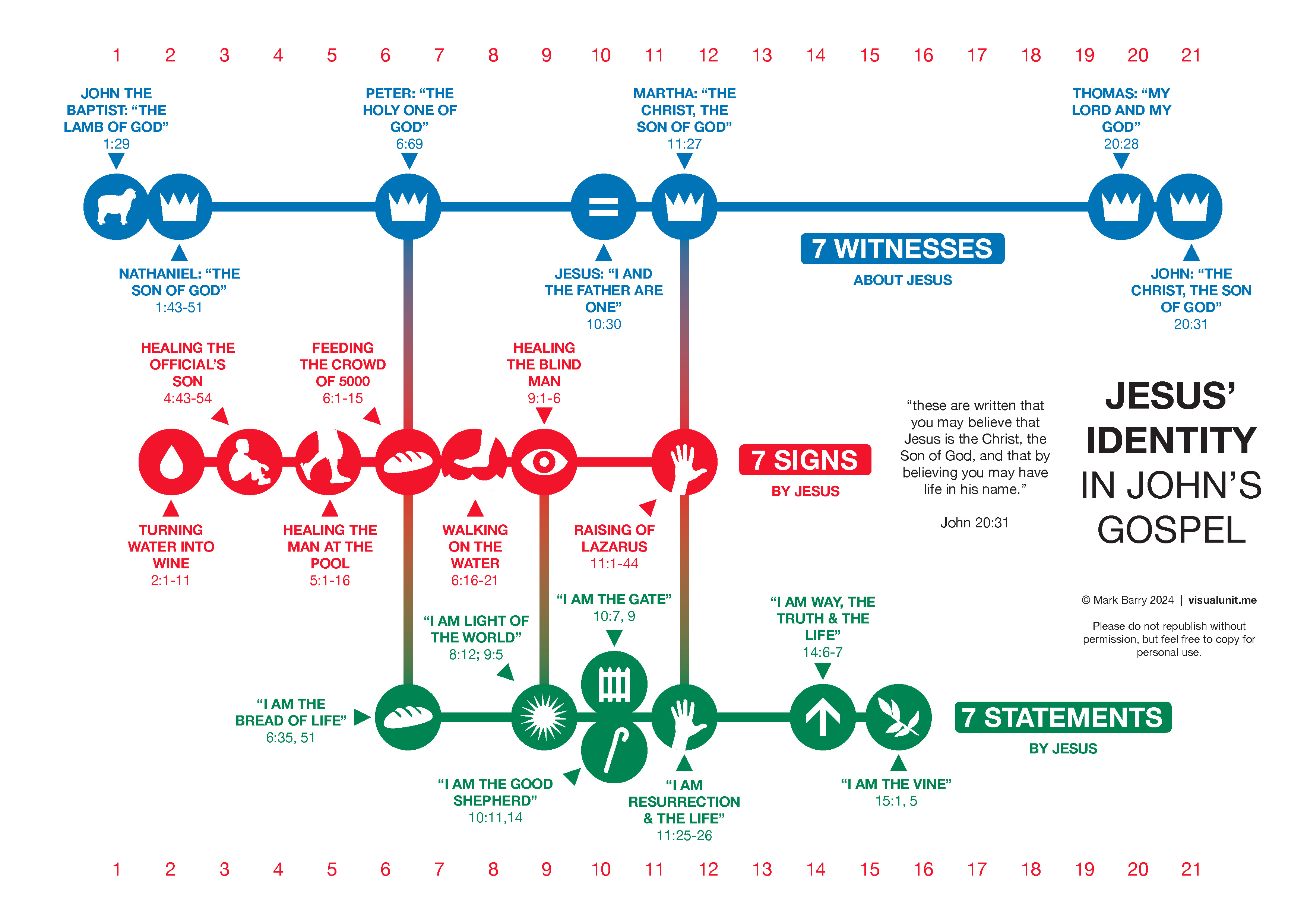 Jesus’ identity in John’s gospel Posted on February 15, 2024 by Mark Standard An overview of John’s gospel, showing how the 7 witnesses, 7 signs, and 7 ‘I am’ statements work together to show the true identity of Jesus, i.e. that he is ’the Christ, the Son of God and that by believing you may have life in his name’ (20:31). Rate this:Share this: Click to share on Facebook (Opens in new window) Facebook Click to share on X (Opens in new window) X Like Loading... Related