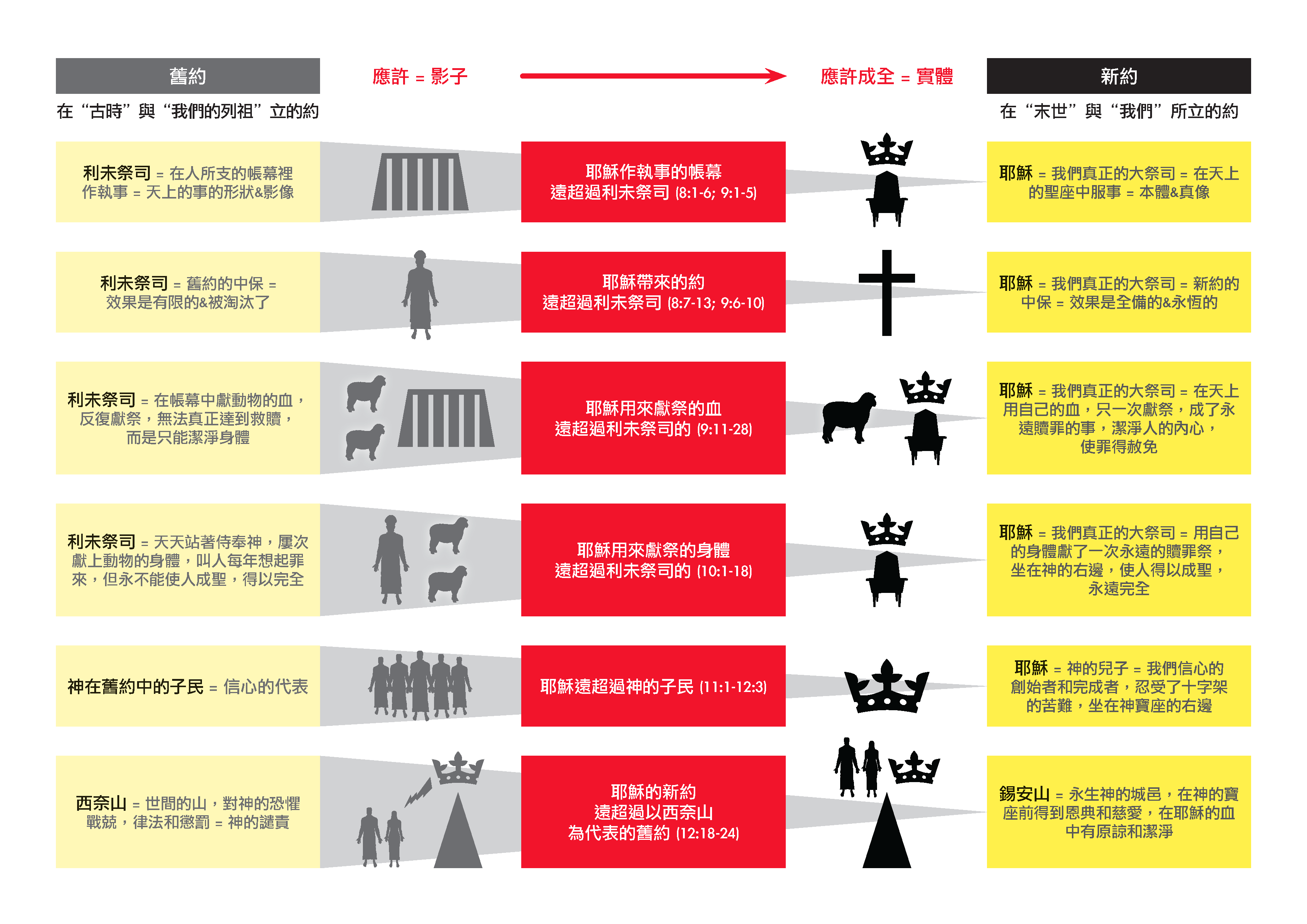 The shadow and the reality in the book of Hebrews, i.e. the contrast between the old and new covenants. Traditional Chinese script, translated by mimaigongfang.com. PDF version (316 KB).