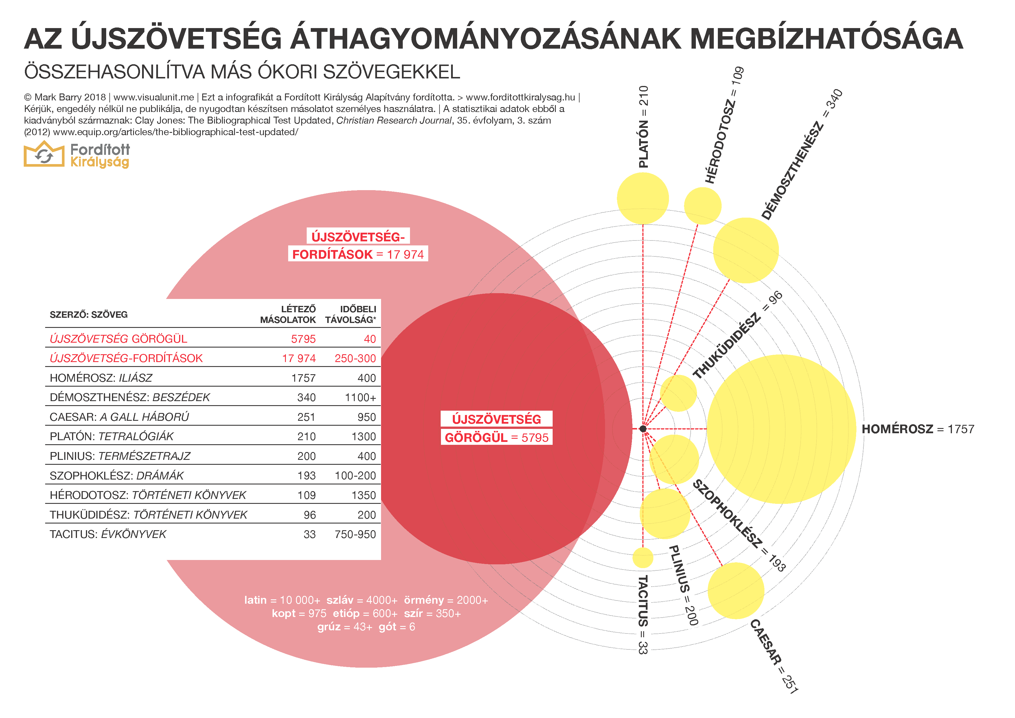 Ezt a infografikát a Fordított Királyság Alapítvány fordította. > http://www.forditottkiralysag.hu | Kérjük, engedély nélkül ne publikálja, de nyugodtan készítsen másolatot személyes használatra. | A statisztikai adatok ebből a kiadványból származnak: Clay Jones: The Bibliographical Test Updated, Christian Research Journal, 35. évfolyam, 3. szám (2012) http://www.equip.org/articles/the-bibliographical-test-updated/
