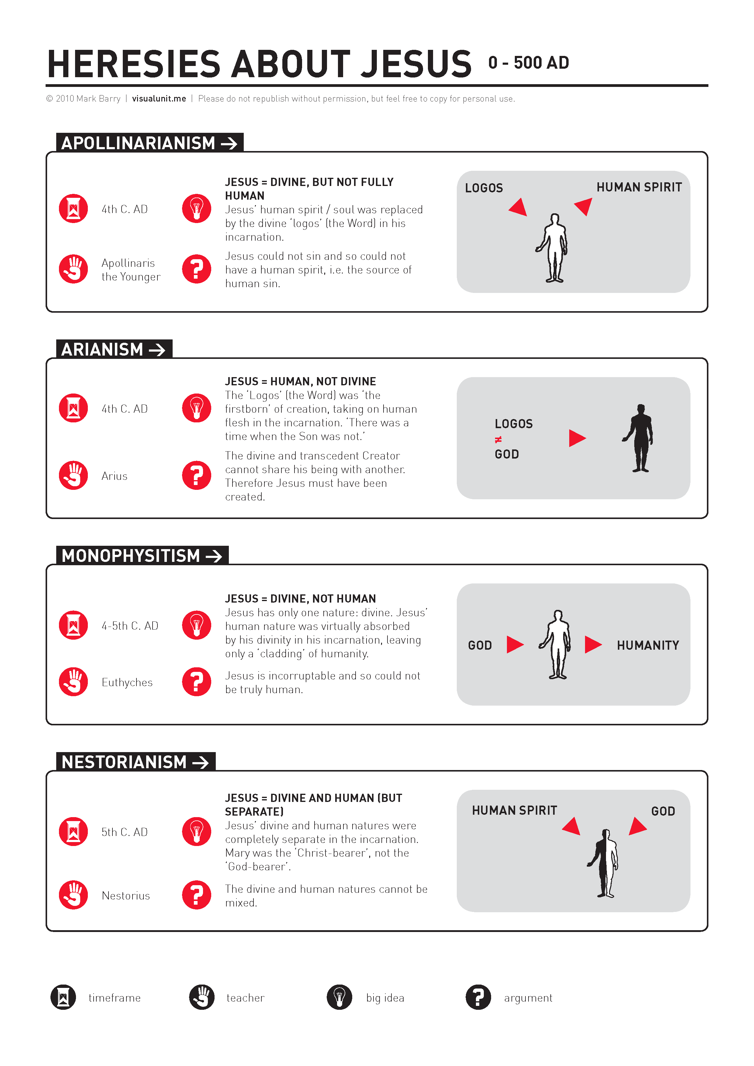 Heresies about Jesus Posted on September 27, 2010 by Mark Standard Reply Major heresies about Jesus from the first five centuries (0-500 AD). PDF version (772 KB) Rate this: