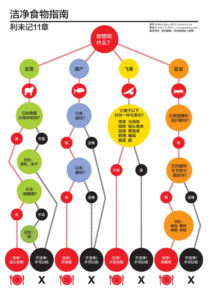 A guide to (un)clean eating according to Leviticus. Simplified Chinese script, translated by mimaigongfang.com.