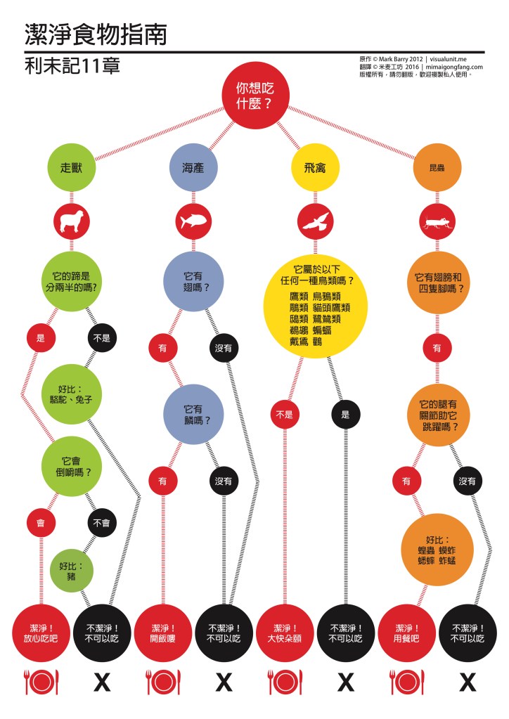 A guide to (un)clean eating according to Leviticus. Traditional Chinese script, translated by mimaigongfang.com.